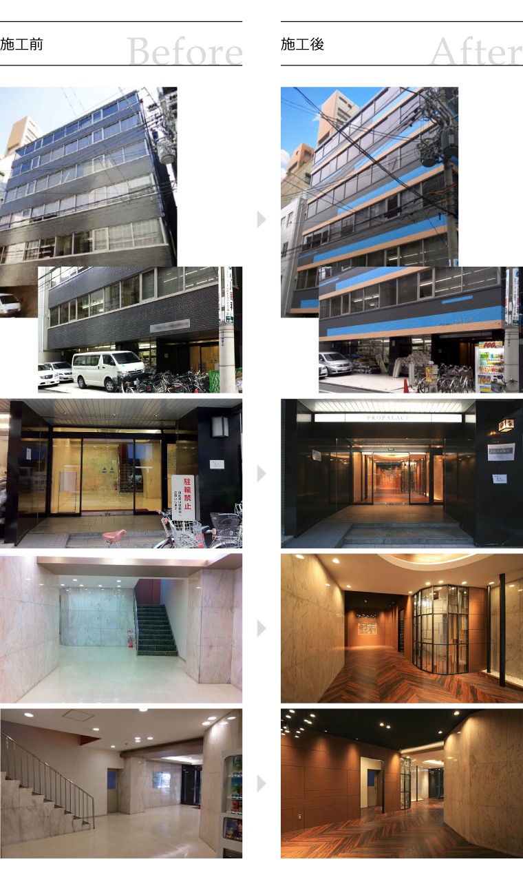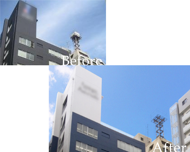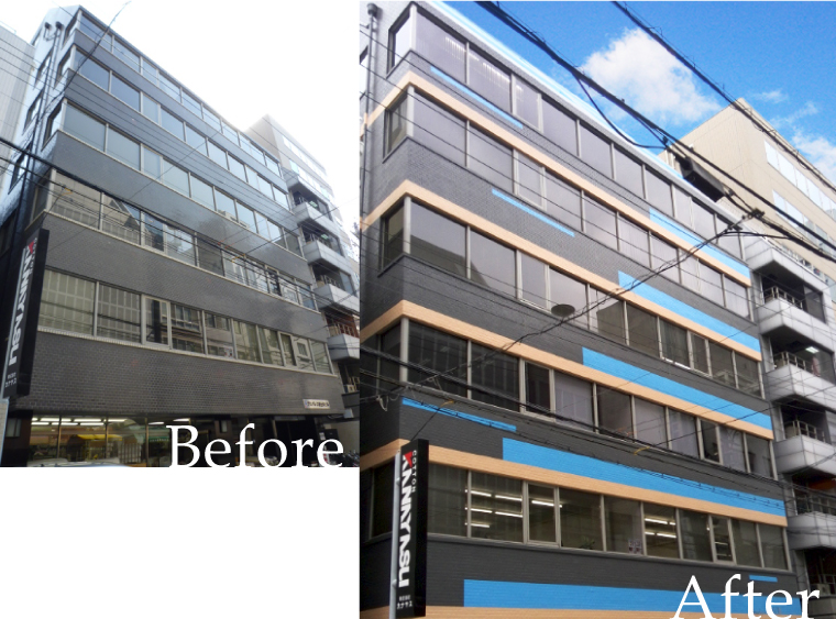 施工後は、外観は遠目でもかなり目立つオシャレなビルに生まれ変わり、しかも費用を抑えることができ、大満足です。現在、賃料を上げてリーシングしていただいています。