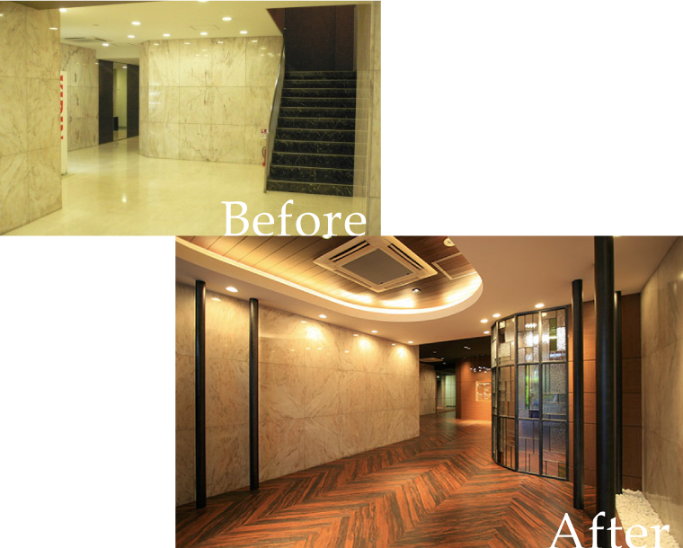 古めかしい階段をステンドガラスのパーティションで目隠しをし、床や壁には木目調のPタイルやカッティングシートを使用、また、照明を暖色系に変更することで、低予算でも高級感、重厚感のあるエントランスを実現しました。