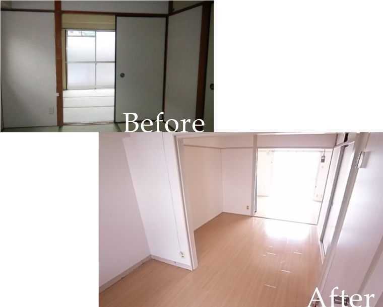年期の入った畳を全てフローリングに変え、ふすまを取り除き、傷が目立つ木枠を全て白で塗装し、室内が広く感じる入居しやすい空間に。